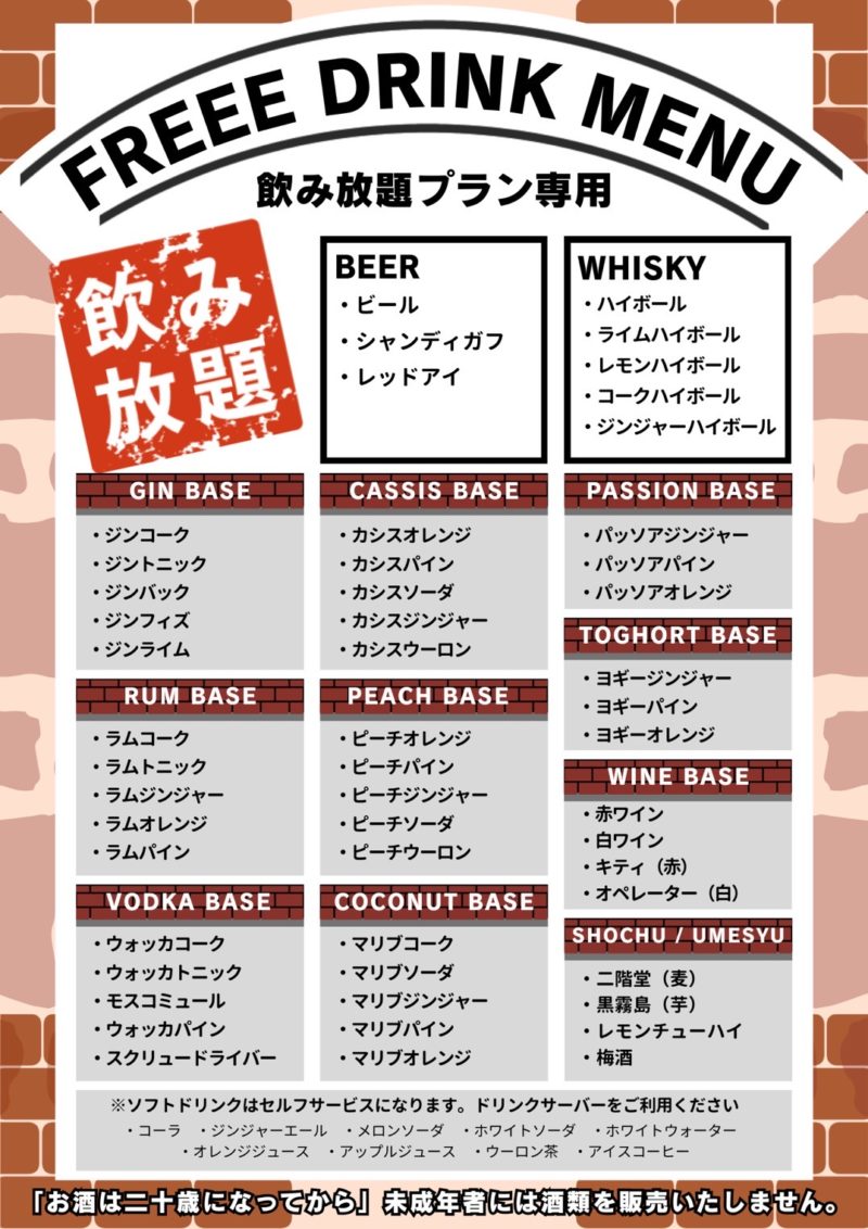 詳しい料金システム・アルコールメニューはこちら↓
